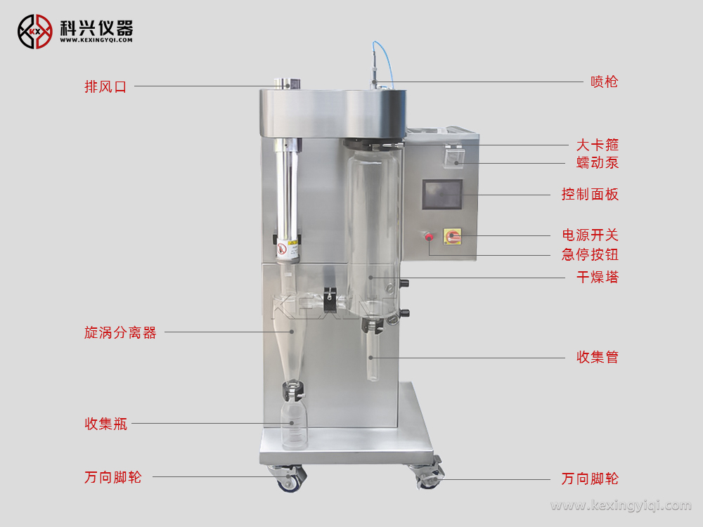 整機(jī)全不銹鋼制作;二流體噴霧的霧化結(jié)構(gòu),噴霧、烘干及收集系統(tǒng)采用透明的優(yōu)質(zhì)高硼硅耐熱玻璃材料制造
